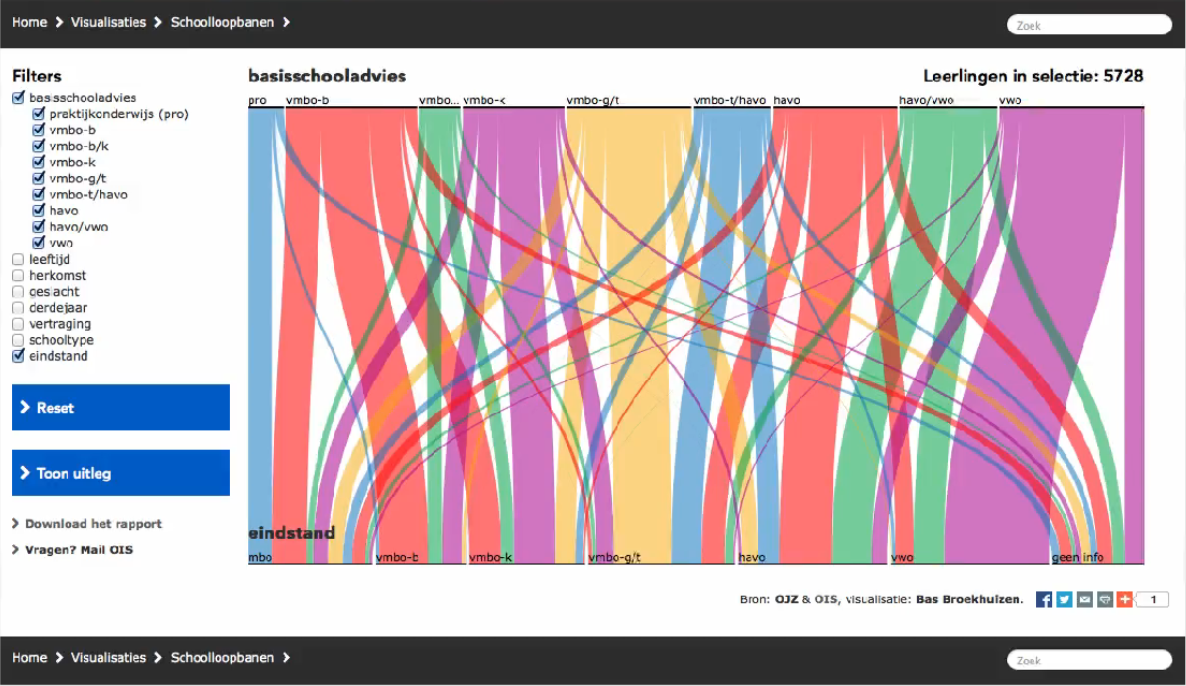 Bureau Onderzoek en Statistiek volgt al langere tijd de verrichtingen van leerlingen in het Amsterdamse voortgezet onderwijs. Hoe verlopen hun schoolloopbanen? Welk advies kregen ze op de basisschool? Bleven ze zitten? Gingen ze over naar een ader niveau? En op welk niveau deden ze eindexamen? In 2014 maakte ik een interactieve visualisatie die hielp bij het beantwoorden van deze vragen. Officieel was het een sankey diagram maar intern kwam hij al vrij snel bekend te staan als de schoolloopbanen spaghetti.